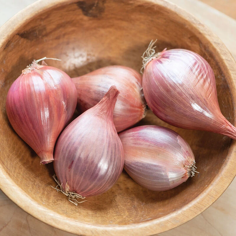 Large, half-long style French shallots with reddish-copper skin and white flesh. Very firm, and suitable for long storage through spring. Adaptation: 40–60° latitude.