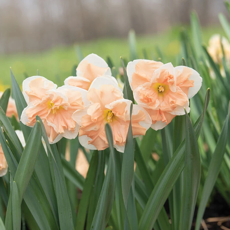 Blooms are fragrant and substantial at 3–4″ wide. Eye-catching, peachy-pink, split corona ruffles and whirls against a backdrop of ivory petals. The ruffled corona, or cup, is split, giving a layered and upward-facing appearance. Plants and stems are tall enough for cutting, but compact and very sturdy. A nice complement to our other Butterfly-type daffodils Orangery and Dancing Moonlight.