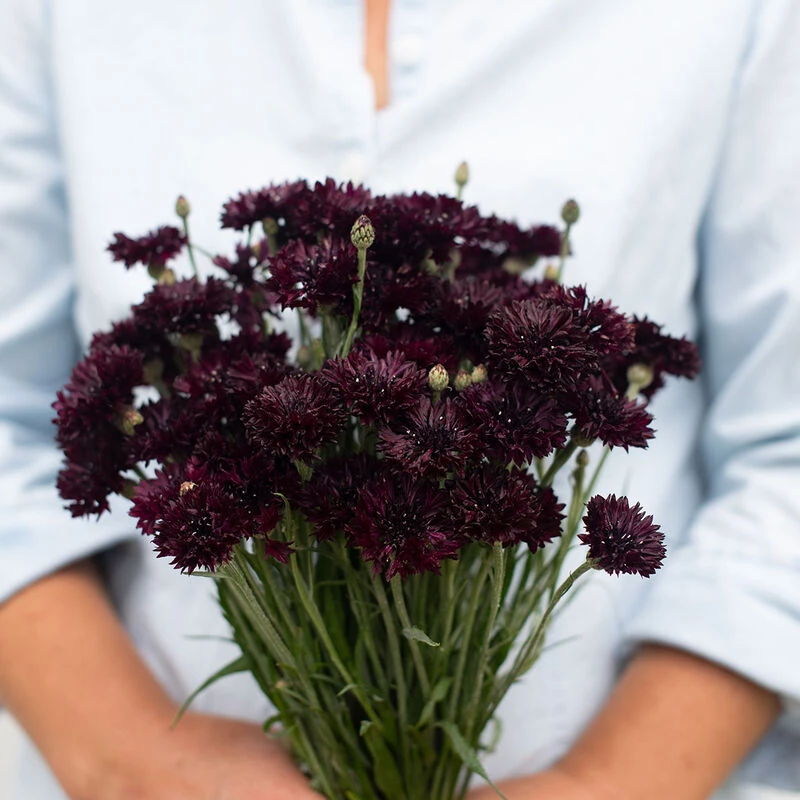 Upright plants produce abundant double and semidouble 1–1 1/2″ blooms. Prefers cool temperatures. Also known as cornflower, garden cornflower, and bachelor’s buttons.