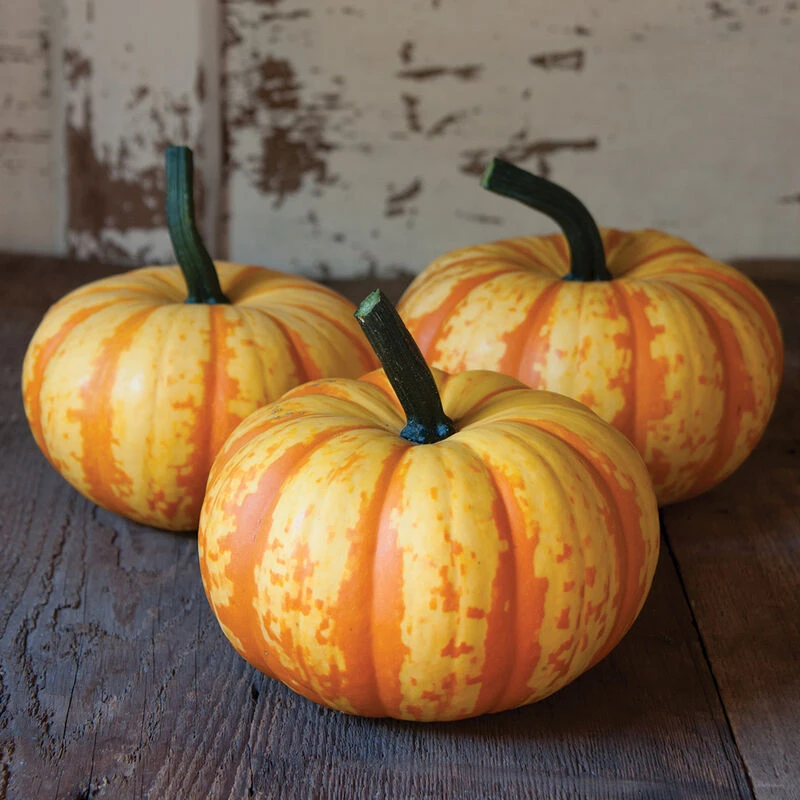 Flashy yellow, orange-striped fruits are flattened-round with shallow ribs. Sturdy, short-vine plants have excellent powdery mildew resistance and produce very high yields of 2 1/2–3 1/2 lb., 7″ diam. x 3 1/2″ tall fruits with exceptional uniformity in shape and size. Bright color and remarkable productivity make Blaze a fantastic addition to any ornamental lineup. Treated seed. Also available untreated.