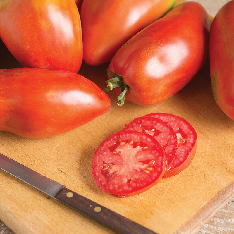 This “sausage” type paste tomato produces large, 8–10 oz., elongated fruits that are easy to process into sauce. An excellent canning tomato, it also tastes great when eaten fresh. Attractive green shoulders give a distinct heirloom look. Fruits ripen during a concentrated period, allowing for a more efficient canning process. It is well-adapted to northern climates, and resists disease and blossom end rot better than others of its type. This strain of Blue Beech was originally brought to Vermont from Italy during WWII. Indeterminate. USDA Certified Organic.