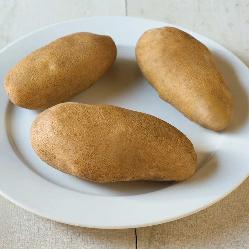 Developed by the University of Maine, Caribou Russet has the best classic baked potato flavor we’ve found. Also excellent for mashing. Moderate yields of very attractive, oval-to-oblong, russeted tubers that store well. Shape is generally more elongated than Gold Rush. Bred for cool climates, Caribou Russet performs best in the northern tier of the US. Resistant to golden nematode race Ro1. Plant Variety Protected.