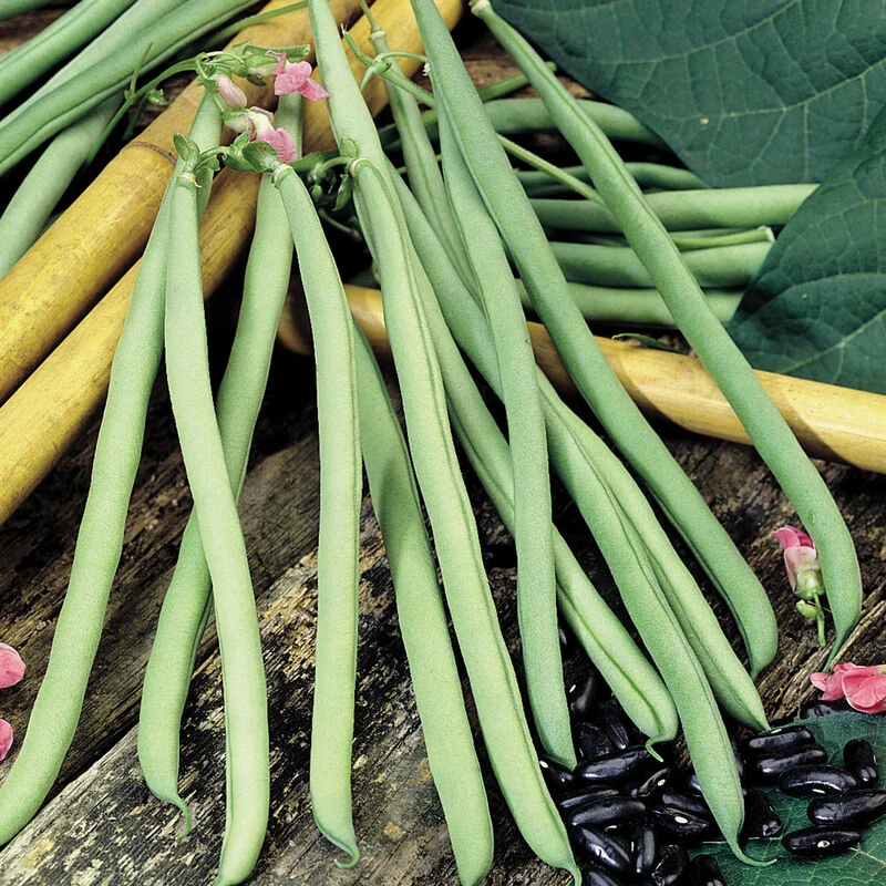 Straight, medium-green pods with sweet flavor. The pods are shorter than Fortex’s at 6–7″, but are faster to mature. Purple flowers. Black seeds. Pole bean; requires trellising.