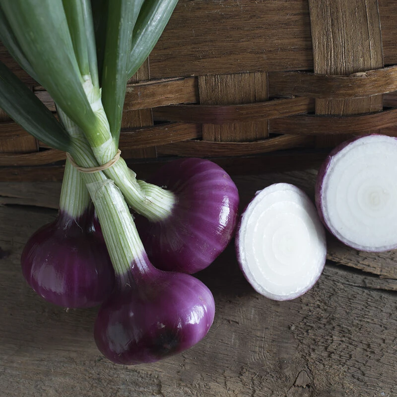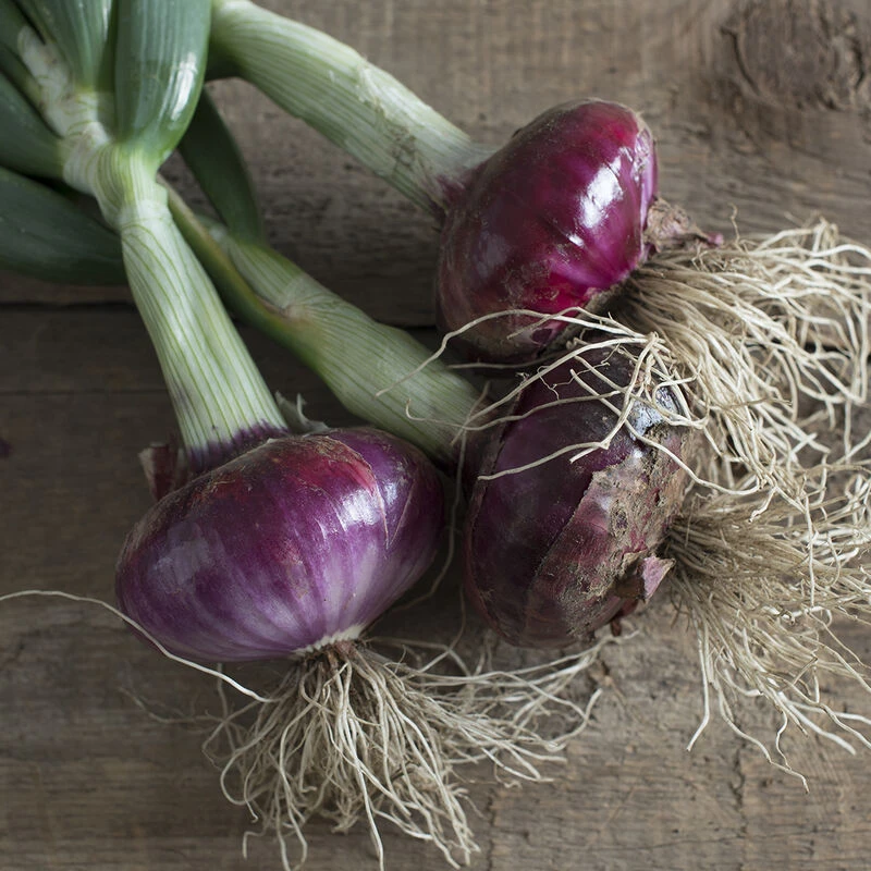 Beautiful flat-round bulbs with rich purple skins. The most bolt-tolerant red onion in our ME and NH overwintering trials. Very sweet flavor with a spicy kick in the spring. Attractive bunches at 2″ diameter, but can also be grown to 3″ bulbs. Harvest-ready for spring markets (mid-late May, early June). Overwinter Desert Sunrise alongside Bridger for red and yellow spring onions. Also an excellent onion for fall and spring sowing in the South. For short-term storage (2–3 months). Adaptation: 30–36° latitude for spring sowing, 30–50° for overwintering.
