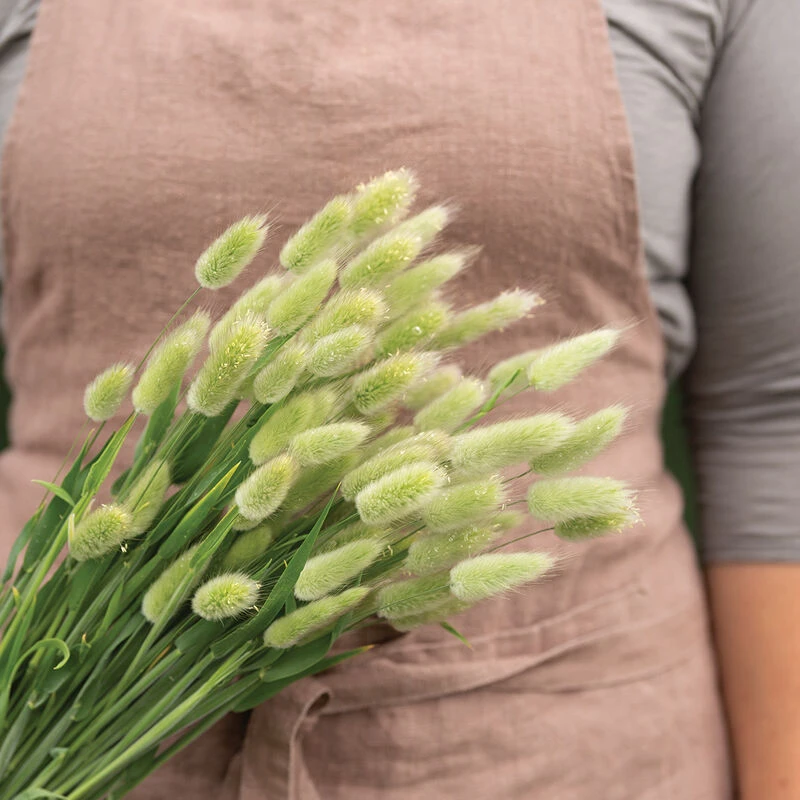 Charming, annual ornamental grass grown for its fuzzy, “bunny tail” blooms. 1 1/2–2″ long oval, woolly blooms resemble a rabbit’s tail. Flowers sit well above a clump of compact, light green grass. Very easy to dry. Holds well when dried; accepts dye readily. Developing flower heads are light green, maturing creamy white to soft wheat in color. Also known as bunny tail grass and rabbit tail grass.