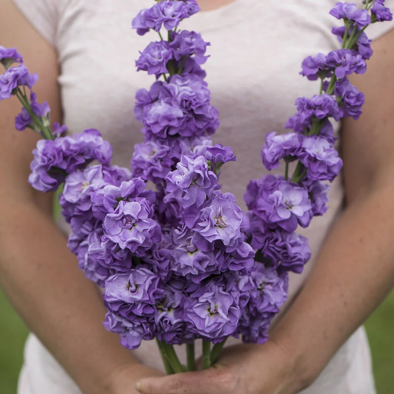 Early single-stem, or column-type stock in a highly uniform series for one-cut harvest. Aptly named for strong, straight, rigid stems. Iron performed well in our spring, early summer, and fall trials. Selectable for doubles and 55% double without selection. Compared to Katz, Iron is slightly later to flower, and has somewhat shorter and thicker stems. Tightly spaced florets on the flower spike make for compact 1 1/2–2″, blue blooms with a full appearance. NOTE: This variety produces one flowering stem per plant. Pinching is not advisable as it will terminate flowering.