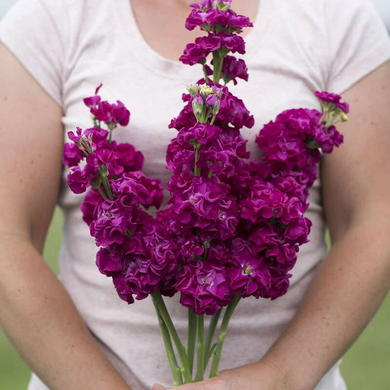 Early single-stem, or column-type stock in a highly uniform series for one-cut harvest. Aptly named for strong, straight, rigid stems. Iron performed well in our spring, early summer, and fall trials. Selectable for doubles and 55% double without selection. Compared to Katz, Iron is slightly later to flower, and has somewhat shorter and thicker stems. Tightly spaced florets on the flower spike make for compact 1 1/2–2″, dark rose-red blooms with a full appearance. NOTE: This variety produces one flowering stem per plant. Pinching is not advisable as it will terminate flowering.