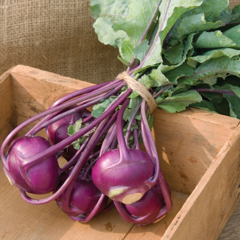 | CULTURE | Kohlrabi prefers mild or cool weather. It is grown throughout the season in the North, and during fall and winter in the South. Sow 15 seeds/ft., 1/4- 1/2" deep, in rows 12-18" apart. Thin fresh-market varieties to 4" between plants. Thin storage varieties to 10" between plants. For earliest crops start in flats or plug trays and transplant. Fertile, well-irrigated soil promotes rapid growth, which makes for a sweeter flavored crop. Harvest when roots are about 2-3" diameter; 8" diameter for storage varieties. |