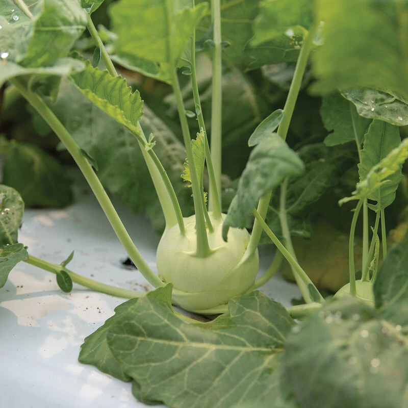 | CULTURE | Kohlrabi prefers mild or cool weather. It is grown throughout the season in the North, and during fall and winter in the South. Sow 15 seeds/ft., 1/4- 1/2" deep, in rows 12-18" apart. Thin fresh-market varieties to 4" between plants. Thin storage varieties to 10" between plants. For earliest crops start in flats or plug trays and transplant. Fertile, well-irrigated soil promotes rapid growth, which makes for a sweeter flavored crop. Harvest when roots are about 2-3" diameter; 8" diameter for storage varieties. |