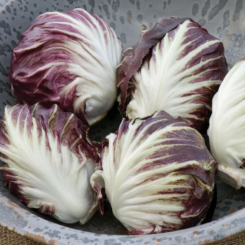 Chioggia-type chicory with dense, 4–5″ diameter heads. The flavor and bright purple color are both enhanced in the cooler fall weather. High bolt tolerance. USDA Certified Organic.