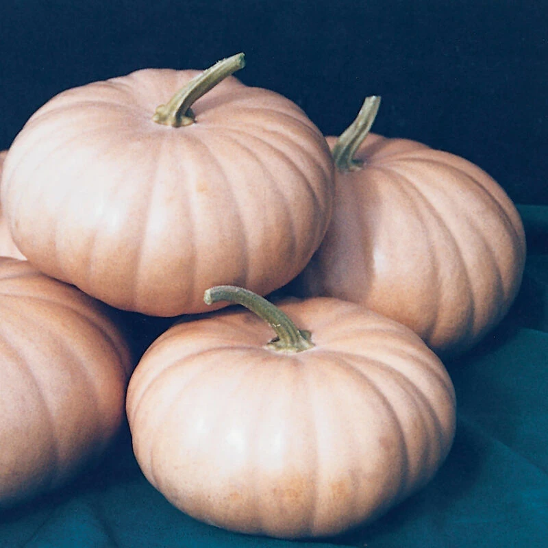 Medium-large, flattened, medium-ribbed, suggesting a wheel of cheese. Smooth, tan skin, slender woody stem. Deep orange, moderately sweet flesh for pie. Long storage. A beautiful oldie. Avg. 6–10 lb.