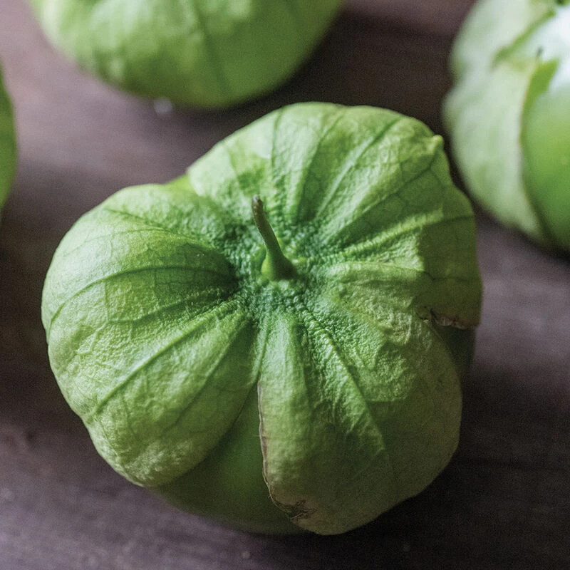 Impressive yield and fruit size for a semi-early tomatillo. Strong, vigorous plant develops a thick trunk to bear the fruit load. Round to apple-shaped fruit. Similar to Super Verde in size and yield, but produces rounder, more uniform fruits earlier and has a more open plant habit. Fruits are about twice the size of Toma Verde’s.