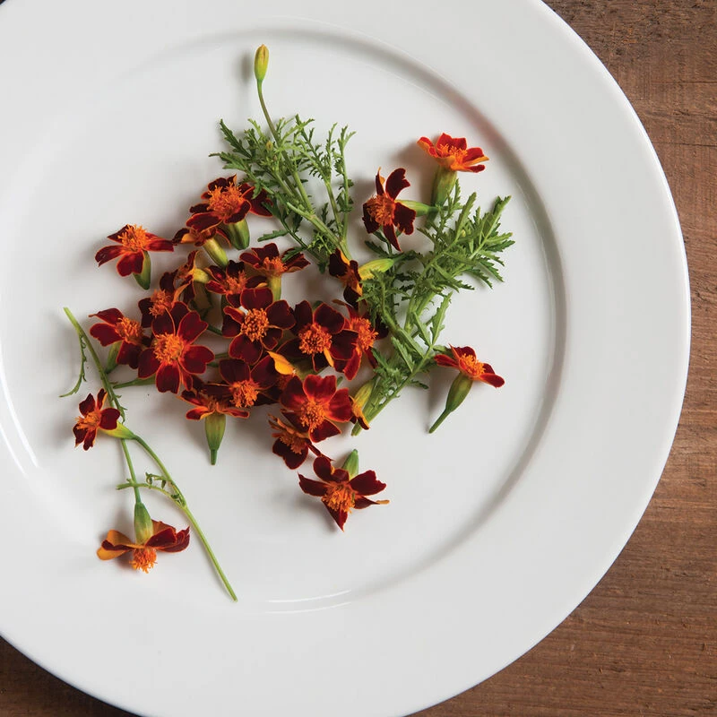 Hundreds of petite flowers cover neat, low mounds of lacy foliage with a citrusy scent. Long-blooming for beds, borders, and containers where it attracts beneficial insects, such as ladybugs, hoverflies, butterflies, predatory bugs, and parasitic wasps. Leaves of the plant are edible and are used as flavorful salad greens and garnish. Also known as signet marigold.