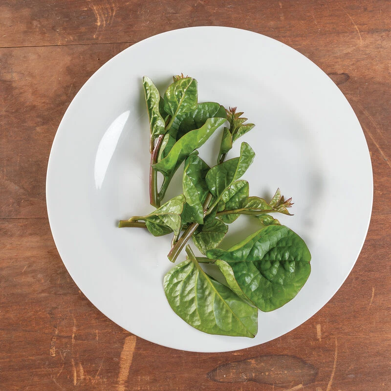 Vigorous climbing vines grow through summer into fall. Glossy, thick, savoyed leaves resemble spinach. Dark green leaves and deep red/purple stems. Mild Swiss chard taste. Use leaves and young stems sparingly in salads or stir-fries.