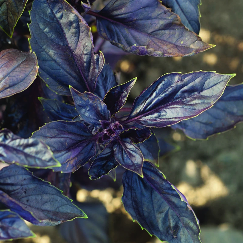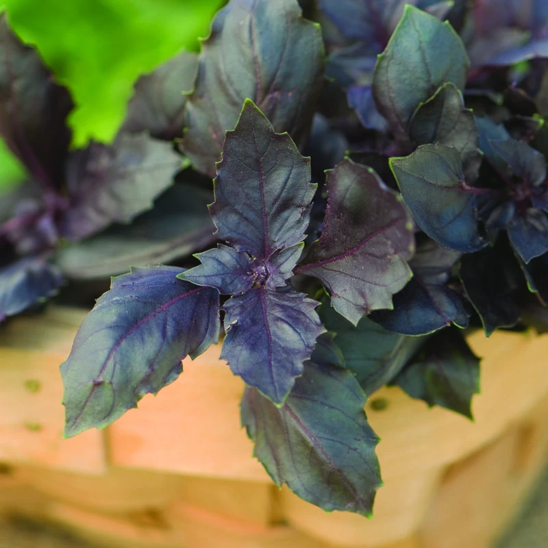 High yields and great flavor. Flat, 3″ long leaves stand out horizontally. Purple flowers and purple-copper leaves make an attractive garnish. Ht. 18–24″.
