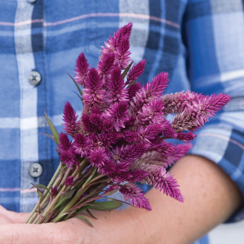 Dark rose, arrow-shaped plumes. 2–3″ textural flower spikes on full, branching plants can stand alone in a bouquet, be used as filler, or make a grand statement in the flower garden. A sweet and sturdy addition to boutonnières. Excellent vase life. Also known as wheat celosia, and red fox.