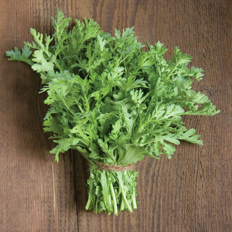 Cut greens when about 4–8″ tall for a flavorful addition to salads, vegetables, pickles, and sushi. Edible, small, orange and yellow chrysanthemum flowers appear later on unharvested plants. This is the preferred “fine” or “small” leaf strain.