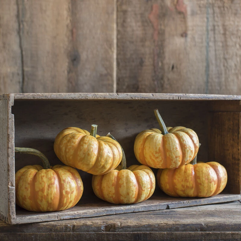 Flattened shape, wide moderate ribs, and yellow-orange skin with deep orange stripes. Fruits weigh approx. 1/2 lb. Similar in size and shape to Jill-Be-Little, the two make an attractive pair for tabletop display. Compared to Hooligan, which it replaced, Spark is a bit smaller with higher, more uniform yields. Not recommended for eating. Medium vine plant habit.