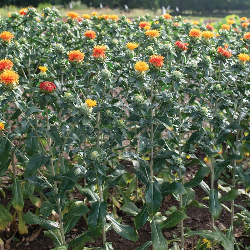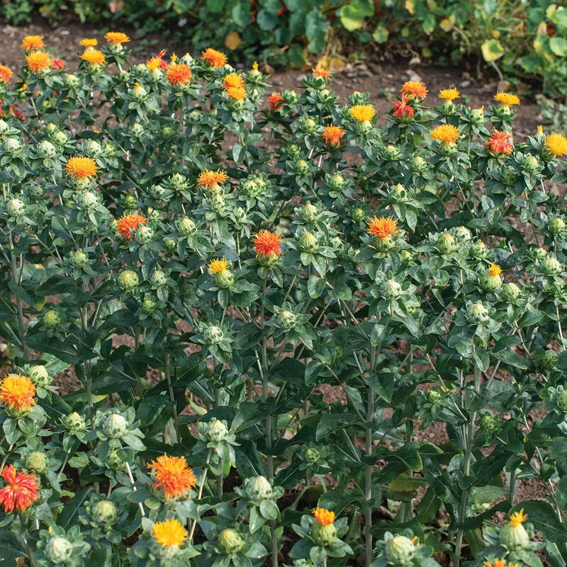 Sturdy, straight stems and branching flower clusters store well and can be used fresh or dried. Stems are easily air-dried for arrangements. Fresh, dark green foliage and geometric buds add structure to mixed bouquets. Great in combination with sunflowers. This strain is nearly thornless for easy harvest. Tufted thistle-like flowers with oval leaves. Fiery orange-and-gold petals are edible and sometimes used as a substitute for saffron. Also known as safflower.